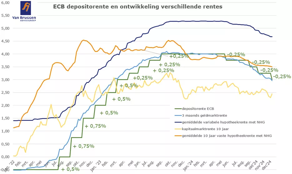 De gemiddelde variabele hypotheekrente daalde de afgelopen 6 weken met 0,24%. Dat is bijna gelijk aan de verlaging van de ECB-rente. De variabele hypotheekrentes volgen met enige vertraging de verlaging van de rente van de ECB.