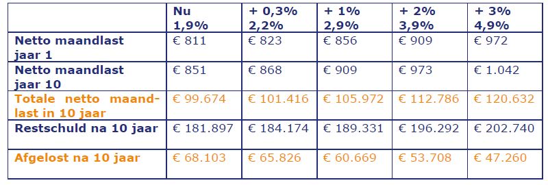 Conclusie: de netto maandlasten schieten niet omhoog bij een hogere hypotheekrente, maar u betaalt wel serieus meer geld per maand. Bij een rentestijging van 1% betaalt u netto in het eerste jaar netto € 45 meer per maand en dat loopt op naar bijna € 60 in jaar 10. Bij een rentestijging van 2% gaat het om respectievelijk bijna € 100 en € 120. Bij een 2% hogere hypotheekrente betaalt u in 10 jaar tijd ruim € 13.000 meer aan netto hypotheeklasten.