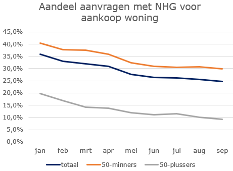 Ook het afgelopen jaar zagen we al dat steeds meer woningen niet meer met NHG gekocht kunnen worden. Het aantal hypotheekaanvragen dat met NHG werd aangevraagd voor een hypotheek voor de aankoop van een woning, daalde van 36% aan het begin van het jaar naar 25% op dit moment. 50-plussers maken sowieso al veel minder gebruik van NHG dan 50-minners; maar het aandeel hypotheekaanvragen met NHG voor een aankoop woning daalde van bijna 20% naar onder de 10%.
