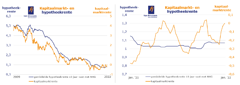 Een heel ander beeld zien we op de financiële markten. Daar loopt vanaf de laatste weken van december de marktrente op met 0,2 à 0,3%, afhankelijk van de renteduur. De rente loopt steeds verder op, doordat steeds meer beleggers zich zorgen maken over de stijgende inflatie.