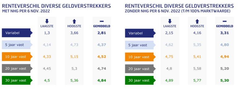 Zoals verwacht stegen afgelopen week de variabele hypotheekrentes, nadat een week eerder de Europese Centrale Bank (ECB) haar beleidsrente met 0,75% verhoogde naar 2%. Die stijging van 0,75% is nog niet volledig verwerkt in variabele hypotheekrentes en de komende weken zal de variabele hypotheekrente dan ook verder stijgen. Bovendien verwachten we dat we nog niet de laatste rentestijging van de ECB hebben gezien en dat de variabele hypotheekrente de komende maanden nog verder zal stijgen.