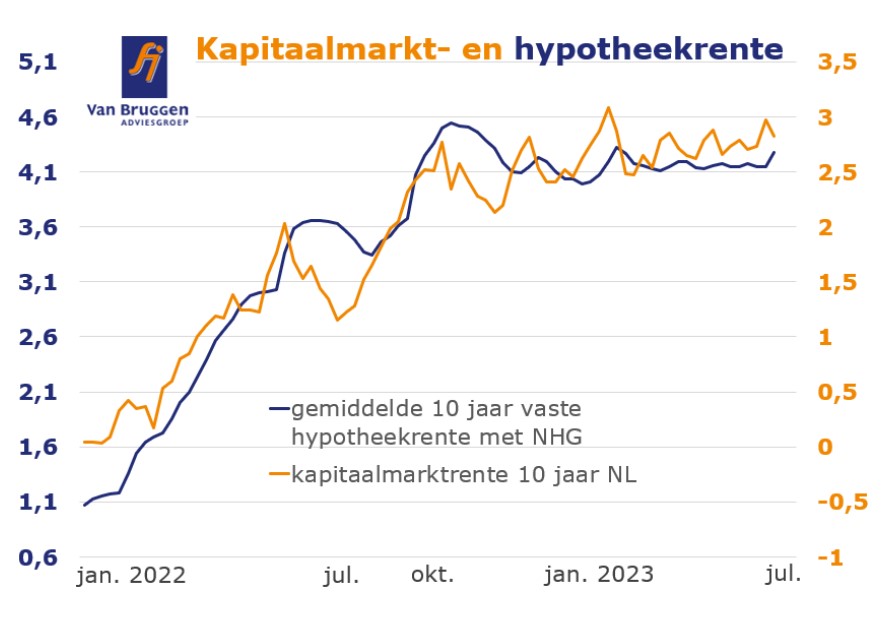 Afgelopen week stegen de vaste hypotheekrentes omdat er onrust onder beleggers was ontstaan over de inflatieverwachting in de Verenigde Staten en de kans groot leek dat de Fed bij de eerstvolgende vergadering haar rente verder gaat verhogen. Maar afgelopen week kwam er juist een gunstig, lager dan verwacht inflatiecijfer over de maand juni. De inflatie kwam uit op 3%, terwijl die een maand eerder nog 4% bedroeg. Ook de kerninflatie daalde