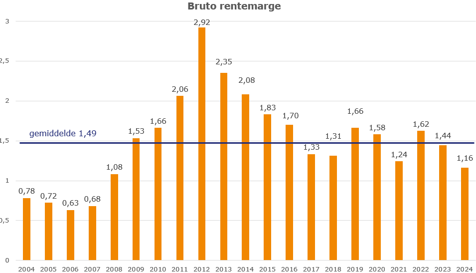 De hypotheekrentes volgen vaak met enige vertraging de marktrentes. Toch is het niet zo raar dat op dit moment de hypotheekrentes minder hard dalen dan de marktrentes. Daarvoor zijn twee redenen. De eerste reden is dat we sowieso zien dat geldverstrekkers in de zomermaanden vaak wat voorzichtiger zijn met het doorvoeren van rentewijzigingen. Ze werken vanwege de vakantie vaak met minder personeel en dan wil je niet meer hypotheekaanvragen binnenhalen door een scherpe hypotheekrente te voeren. De tweede reden is dat de brutomarge dit jaar een stuk lager ligt dan vorig jaar. We kijken daarbij naar het verschil tussen de gemiddelde 10 jaar vaste hypotheekrente met NHG en de 10 jaars Nederlandse staatsleningen. Vorig jaar was het gemiddeld verschil 1,44%, terwijl dit tot nu toe in 2024 slechts 1,16% is. Oorzaak is de scherpe concurrentie op de hypotheekmarkt. In onderstaande grafiek laten we het niveau van de bruto marge per jaar zien.