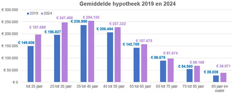 Veel mensen tussen de 25 en 35 jaar kopen voor het eerst een woning. Hun woning is gemiddeld ook minder waard dan die van oudere groepen, zoals we in de vorige grafiek zagen. Toch ligt hun gemiddelde hypotheek met € 247.500 bijna net zo hoog als die van 35- tot 45-jarigen (€ 254.000).