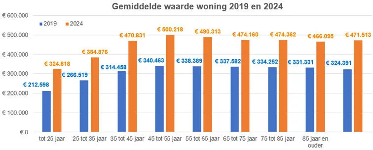 Jongere woningeigenaren hebben te maken met lagere woningwaarden. Voor mensen tot 25 jaar ligt de gemiddelde woningwaarde rond de € 325.000. Bij de groep van 25 tot 35 jaar is dat € 385.000.