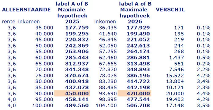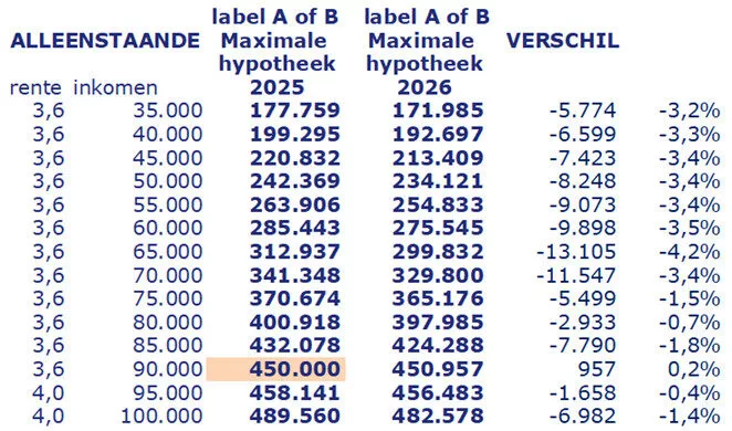 - Een alleenstaande kan in 2026 nog bijna € 300.000 lenen (was circa € 313.000).