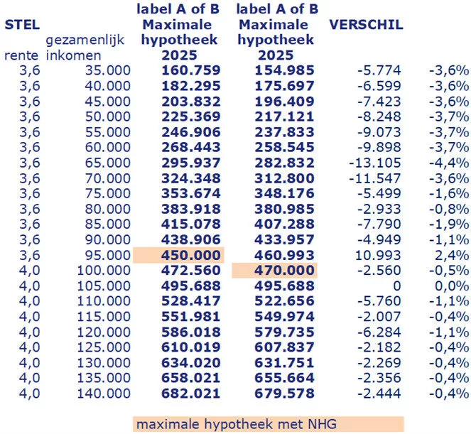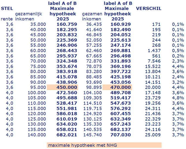 Bij een hypotheekrente van 3,6% en de aankoop van een woning met energielabel A of B betekent dat concreet: