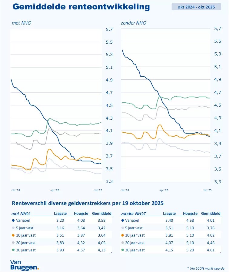 Ook afgelopen week bleven de gemiddelde hypotheekrentes, net als de afgelopen maanden, vrijwel gelijk. Positief is dat het vooral om kleine verlagingen ging. De rentes op de financiële markten dalen, en dat biedt ruimte voor verdere renteverlagingen. Grote dalingen verwachten we overigens niet, maar kleine verlagingen blijven mogelijk.