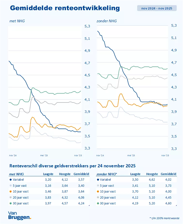 De stijging van de gemiddelde 10 jaar vaste hypotheekrente met NHG is slechts twee honderdste, van 3,62% naar 3,64%. Nog altijd valt de gemiddelde 10 jaar vaste hypotheekrente sinds mei van dit jaar binnen een hele smalle bandbreedte van 0,1%, namelijk tussen de 3,6% en 3,7%.