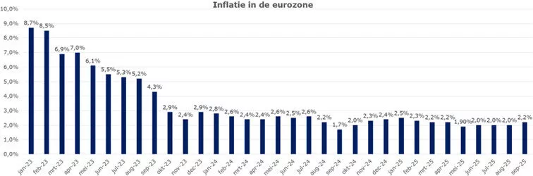 De inflatie in de eurozone steeg van 2,0% in augustus naar 2,2% in september. Daarmee ligt de inflatie iets boven de ECB-streefwaarde van 2%.