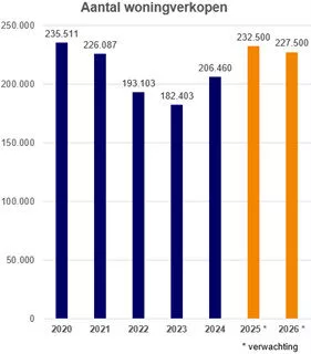 Het aantal woningverkopen in 2025 gaat een stuk hoger uitvallen dan in 2024. Het aantal woningverkopen bereikt zelfs het hoogste niveau in 5 jaar tijd.