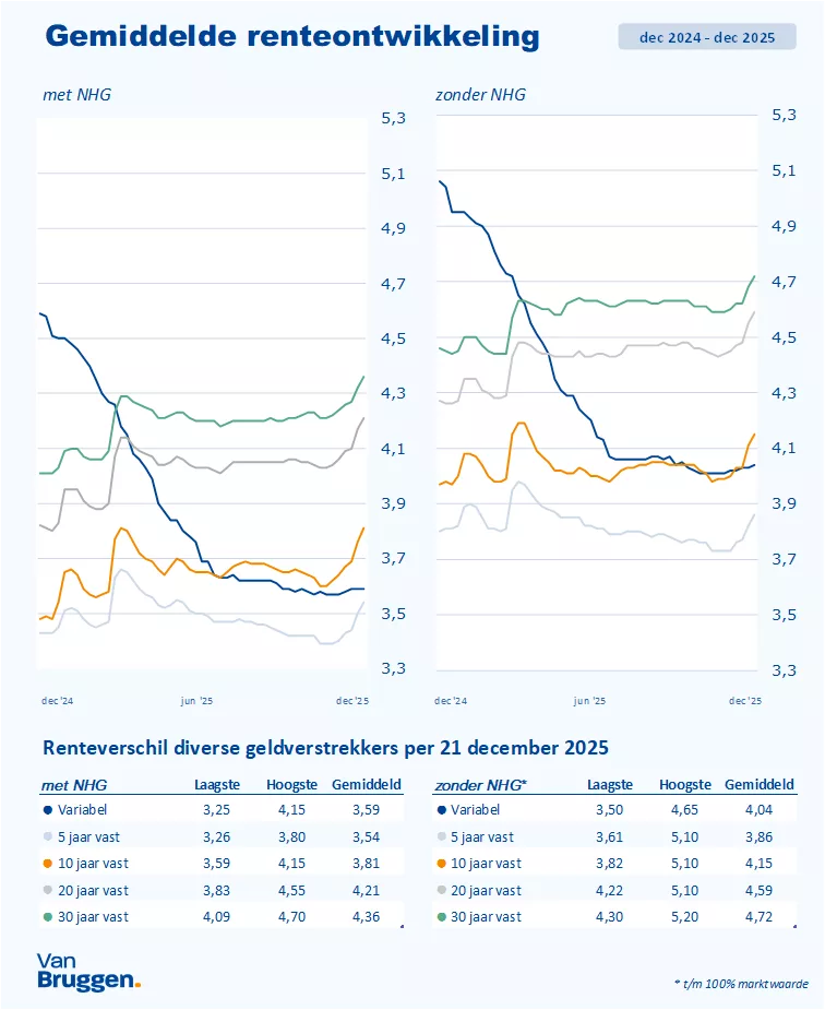 De vaste hypotheekrentes zijn voor de zesde week op rij gestegen. De afgelopen drie weken gebeurde dat telkens met meer dan één of twee honderdsten. Afgelopen week was de stijging kleiner dan een week eerder. We verwachten dat de rente deze week weinig verandert, omdat het een korte week is door Kerst.