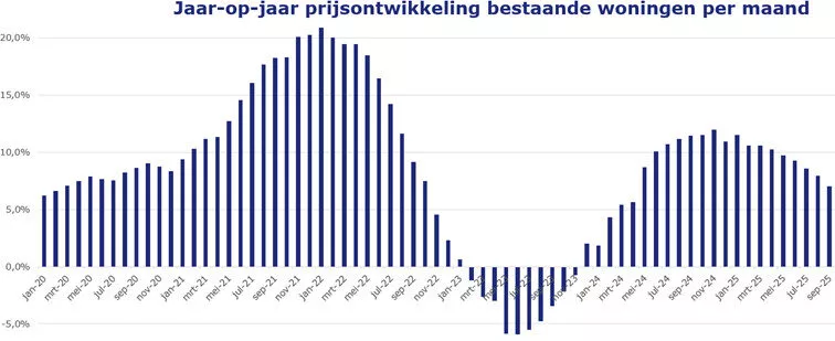 We zien dat de prijsstijging van bestaande woningen elke maand iets kleiner wordt. We verwachten dat deze trend zich de komende maanden voortzet.