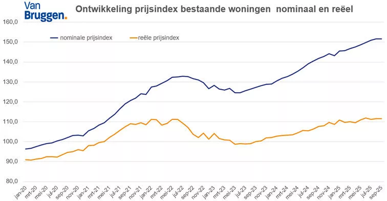 De gemiddelde prijs van een koopwoning bereikte in september een nieuw record: € 489.072. De prijsindex lag 7% hoger dan in september 2024, maar bleef gelijk aan die van augustus 2025. De prijsindex houdt wél rekening met de verschillende soorten koopwoningen. Het gemiddelde doet dat niet.