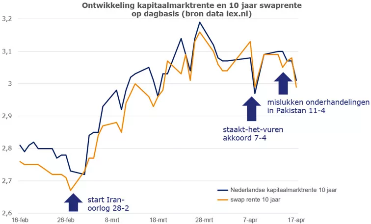 De eerste vier weken van de oorlog in het Midden-Oosten stegen de rentes op de financiële markten. Het bijzondere is dat de rentes op de financiële markten de laatste drie weken relatief stabiel blijven en zelfs daalden eind vorige week. Beleggers hadden blijkbaar een groot vertrouwen dat er alsnog op korte termijn een akkoord komt. Of dat deze week ook zo blijft is een groot vraagteken.