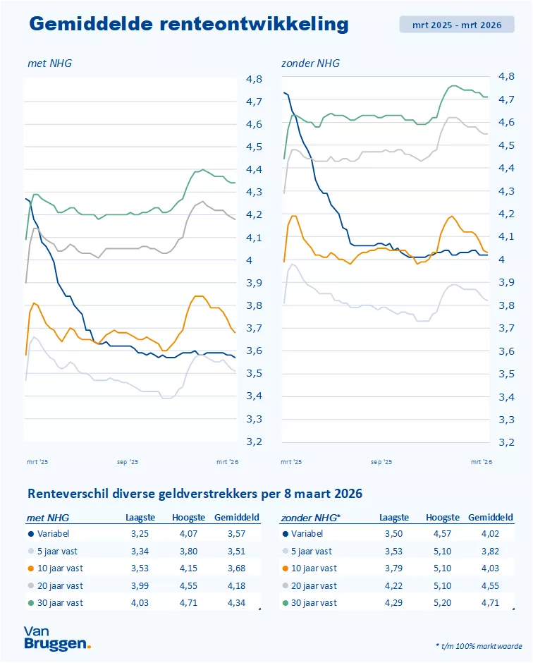 Wij verwachten dat de dalende trend bij de populaire tien jaar vaste hypotheekrente deze week stopt. Die daling hield acht weken aan. Dat komt doordat geldverstrekkers de rente op de financiële markten vaak met vertraging volgen.
