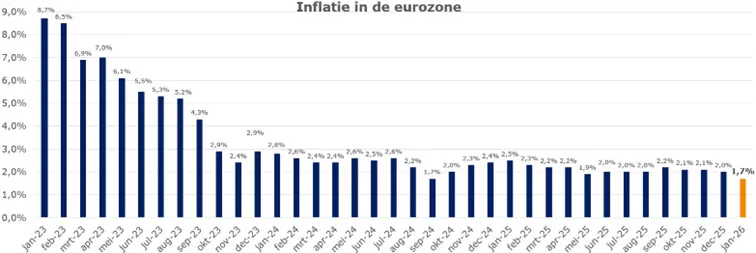 Bij de rentevergadering van afgelopen donderdag (5 februari 2026) veranderde de Europese Centrale Bank (ECB) haar rente niet. De depositorente blijft al vijf vergaderingen op rij staan op 2%. Voor de financiële markten kwam dit niet als een verrassing. De inflatierisico’s zijn op dit moment klein. In januari kwam de inflatie in de eurozone uit op 1,7 procent. Ook de economische groei in Europa geeft op dit moment geen reden tot zorg.