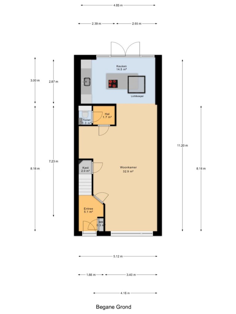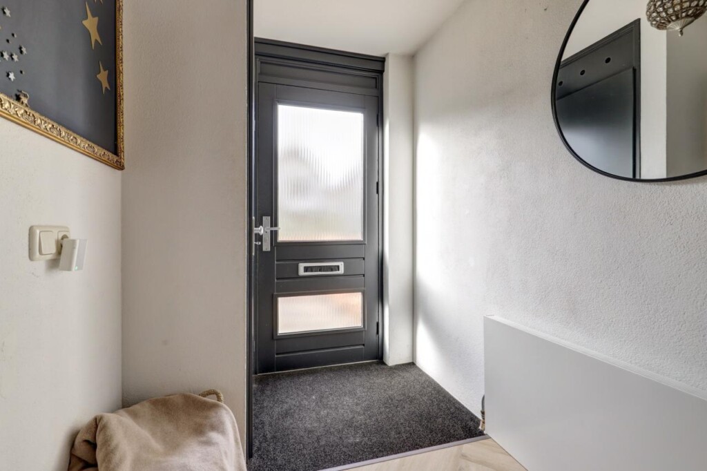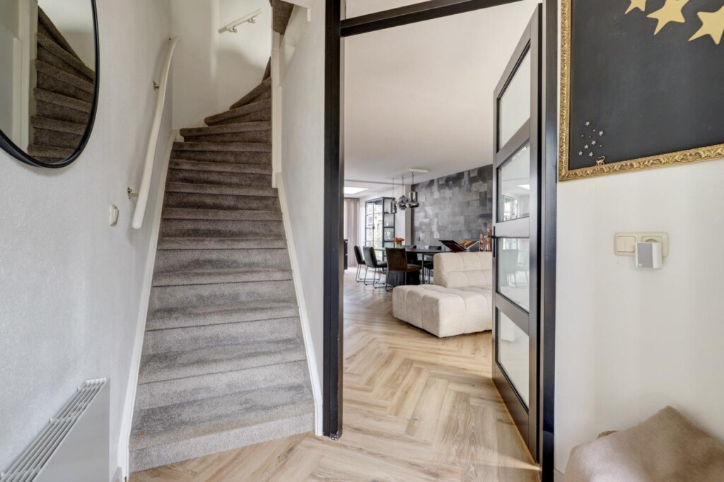 meterkast, trapopgang en de deur naar de ruime woonkamer. De woonkamer is royaal