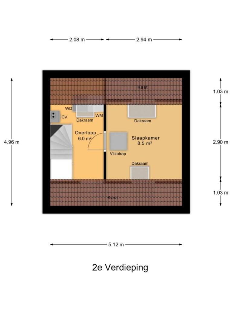 voor veel lichtinval. Achter de knieschotten is er handige bergruimte. Op de voorzolder