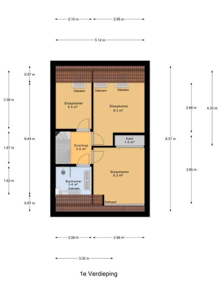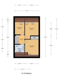 Op de eerste verdieping bevinden zich drie slaapkamers. Aan de achterzijde liggen twee
