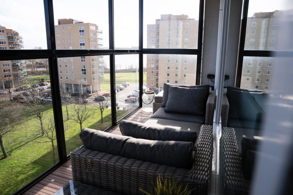 Het balkon op het zuidoosten vormt een prettige buitenruimte op hoogte, waar u in de ochtend en middag van de zon geniet. Het balkon is voorzien van ingebouwde vloerspots en buitenstopcontacten, wat zorgt voor extra gebruiksgemak.