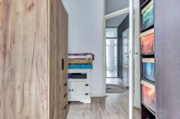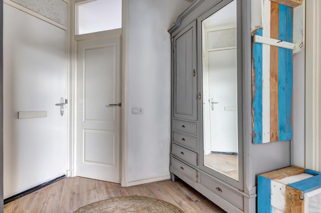 Via de voortuin bereikt u het afgesloten portiek aan de straatzijde. Vanuit dit portiek heeft u toegang tot de eigen voordeur van de woning.