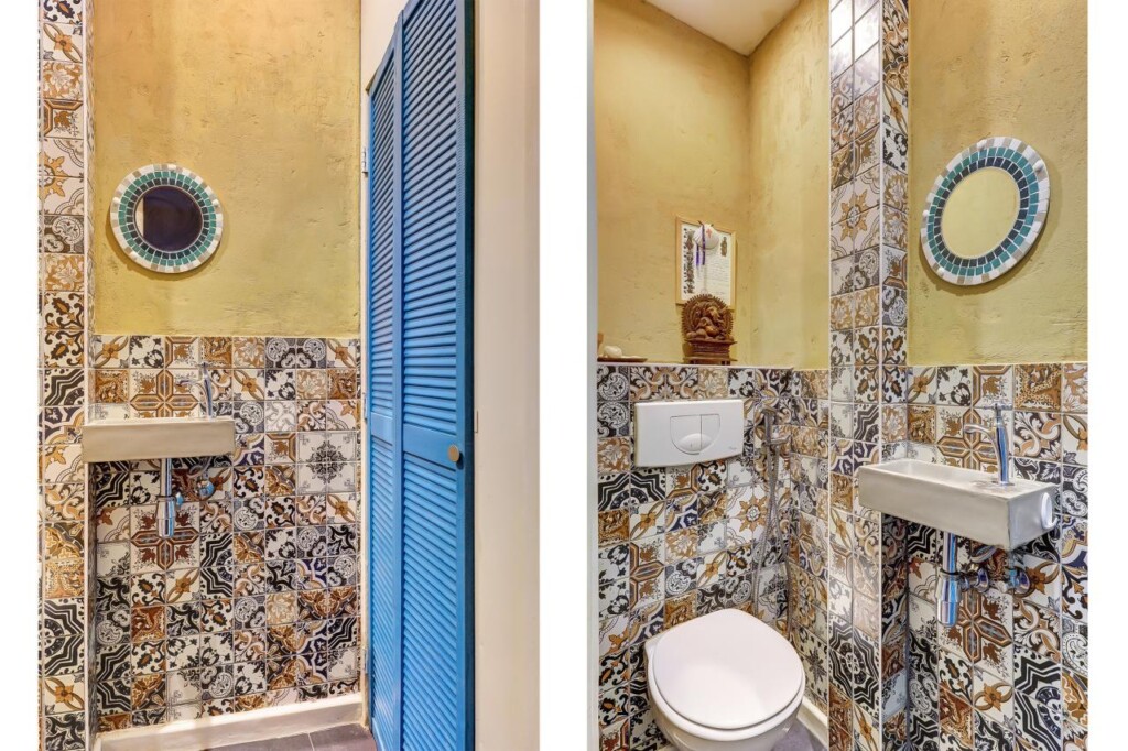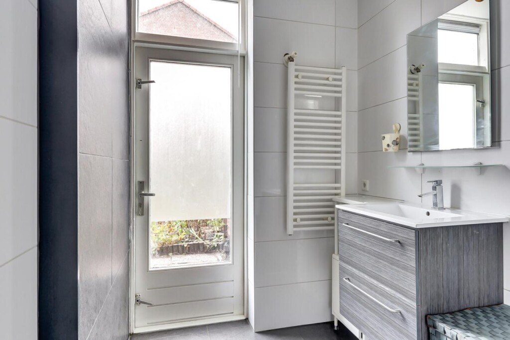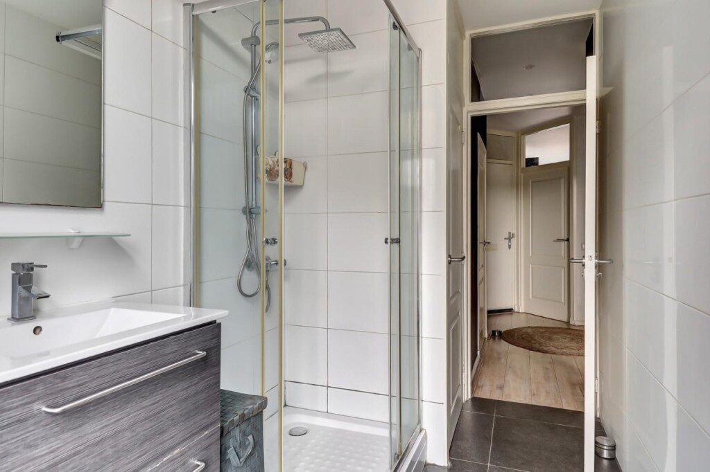 Centraal in de woning ligt de badkamer, voorzien van douche, wastafel en een vaste kast met wasmachineaansluiting en CV-ketel (Intergas, 2020). Het toilet is separaat.