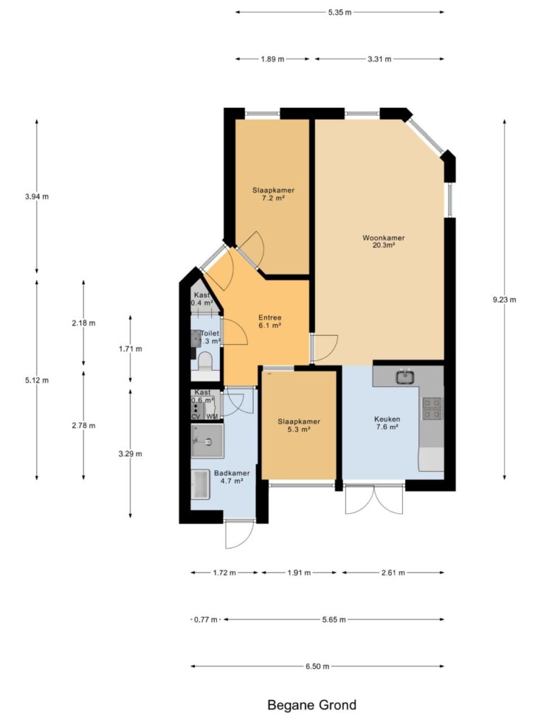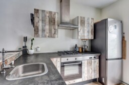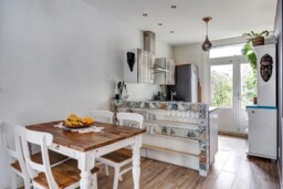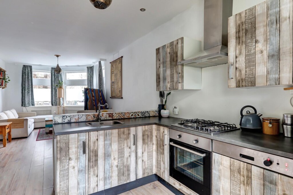 Aan de voorzijde ligt de woon-/eetkamer met erker. De open keuken bevindt zich aan de achterzijde van de ruimte en is uitgerust met moderne apparatuur: een 4-pits gaskookplaat, heteluchtoven en RVS-afzuigkap. Vanuit de keuken geven openslaande deuren toegang tot de achtertuin.