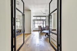 -Black steel pivot doors leading to the hallway with built-in closet and central heating unit.