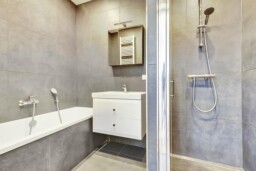 – Luxe badkamer met ruime inloopdouche, ligbad, stijlvol wastafelmeubel met spiegelkast en designradiator.