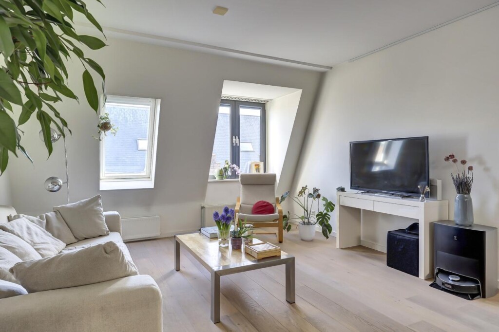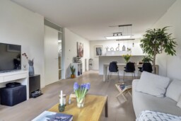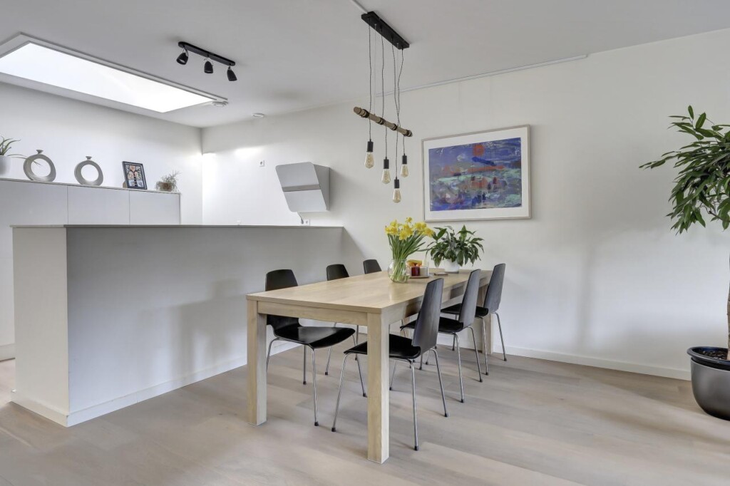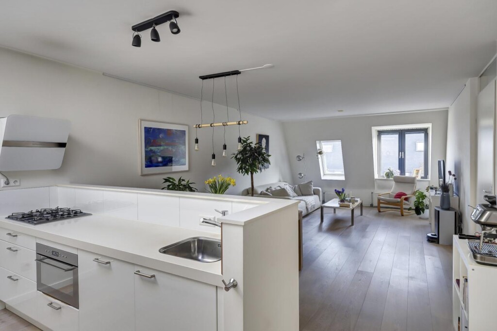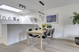De ruime woonkamer vormt het centrale punt van de woning. Dankzij de ligging op de bovenste verdieping ervaar je hier een open en vrij gevoel, met veel daglicht dat de ruimte binnenvalt. De woonkamer gaat naadloos over in de open keuken, waardoor een uitnodigende leefruimte ontstaat waar koken, eten en ontspannen moeiteloos samenkomen.