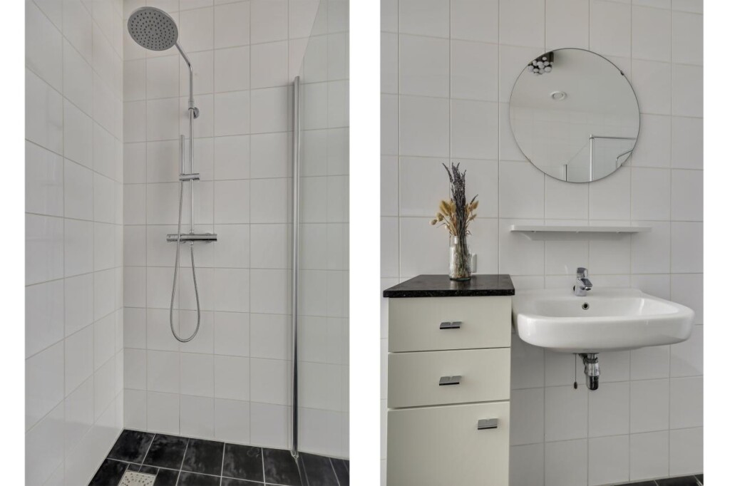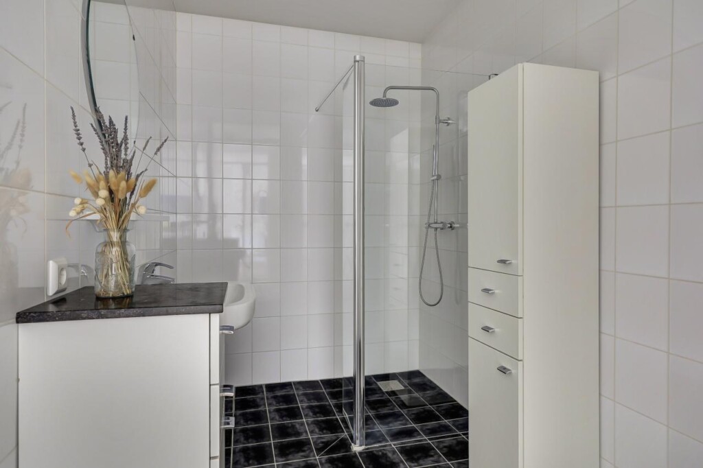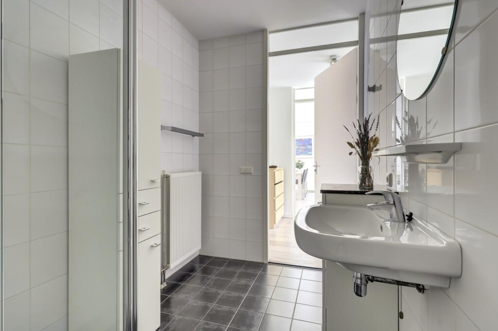 De ruime badkamer is verzorgd uitgevoerd en voorzien van een comfortabele inloopdouche en wastafel. Daarnaast beschikt de woning over een separaat toilet, wat het dagelijks comfort verder vergroot.