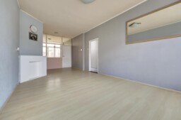 Aan de voorzijde van de woning bevindt zich een slaapkamer. Vanuit de hal bereikt u tevens de ruime en lichte woonkamer. In deze ruimte is door middel van een lichte scheidingswand met glas een extra (slaap)kamer gecreëerd. Dankzij de glazen elementen blijft de woonkamer prettig licht en ruimtelijk, terwijl de afgescheiden kamer uitstekend te gebruiken is als slaapkamer, werkruimte of studeerkamer. Deze indeling biedt veel flexibiliteit en is eenvoudig aan te passen aan de eigen woonwensen.