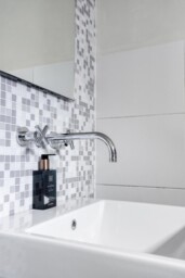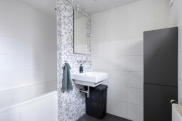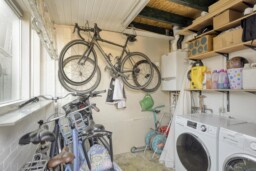 Aan de tuinzijde bevindt zich de keuken, modern van uitvoering en praktisch van opzet. Hier vind je de hedendaagse inbouwapparatuur en voldoende werk- en kastruimte om zowel doordeweeks als uitgebreid in het weekend prettig te kunnen koken. De opstelling is functioneel en compleet, met onder meer een ruime oven, afzuigkap, koelkast, vaatwasser en 5-pits gaskookplaat. Het informele zitje maakt dit bovendien een fijne plek om de dag rustig te beginnen met koffie en ontbijt. Vanuit de keuken is ook de kelder bereikbaar, ideaal als extra provisie- of bergruimte. Aansluitend bevinden zich de bijkeuken, het separate toilet en de badkamer met douchebad en wastafelmeubel, waardoor de begane grond verrassend compleet is ingericht.