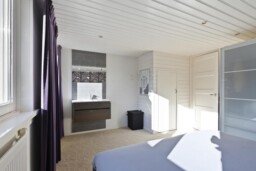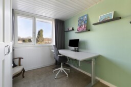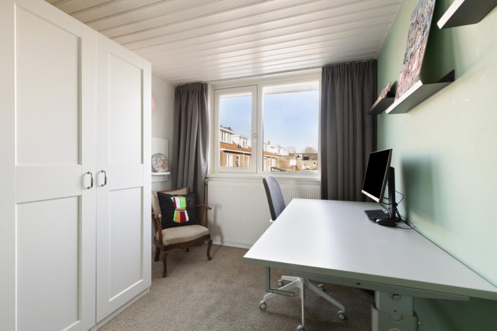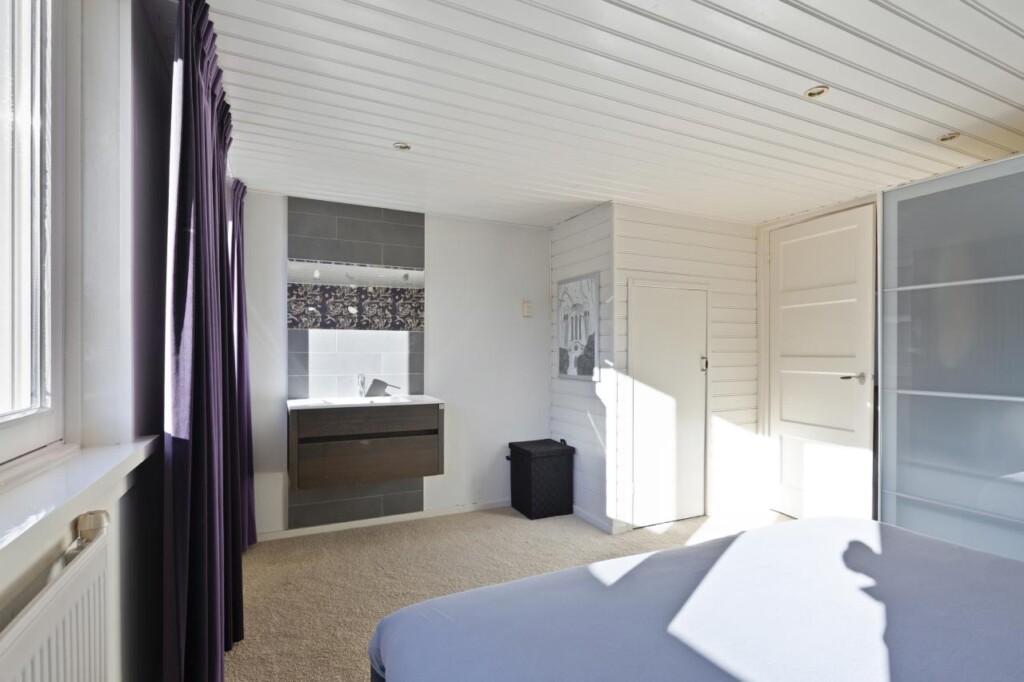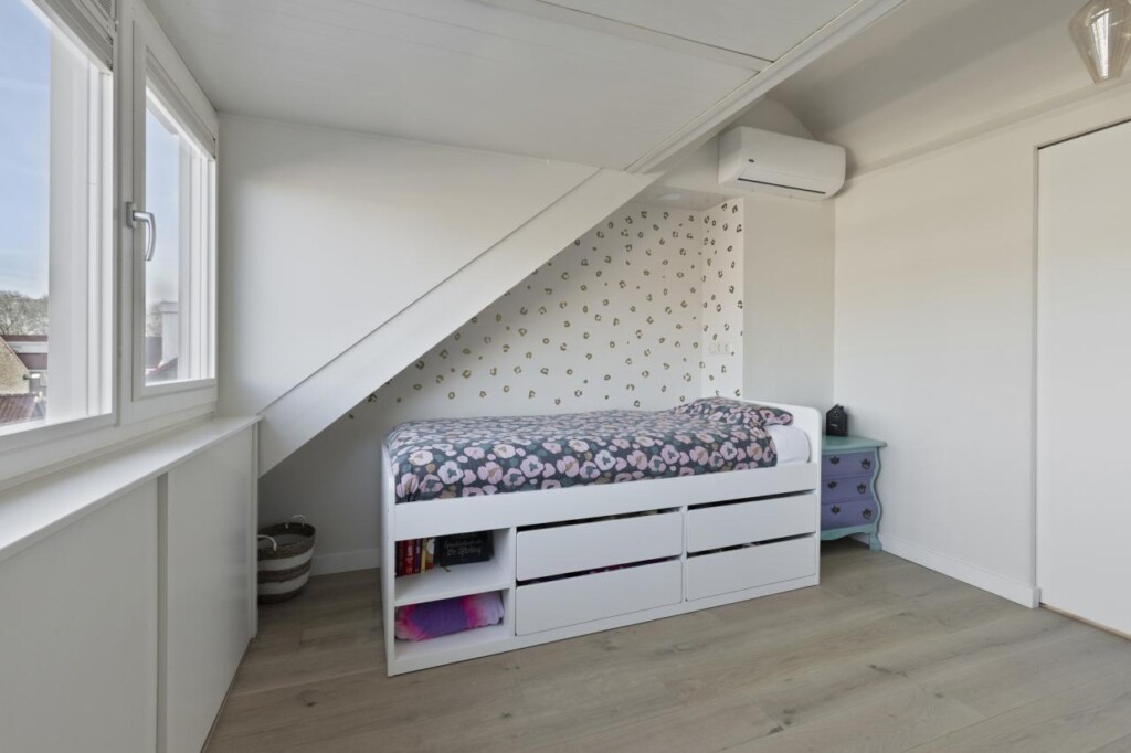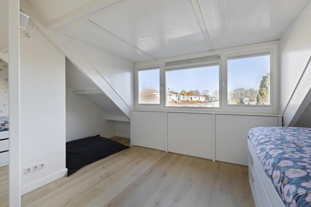 De tweede verdieping is een echte verrassing. Deze verdieping is in 2024 opnieuw ingedeeld en biedt daardoor een eigentijdse en slimme invulling van de beschikbare ruimte. Aan de voorzijde bevindt zich de voorzolder met praktische bergruimte, waarna je via een schuifdeur toegang krijgt tot een bijzonder royale derde slaapkamer. De dakkapel vergroot niet alleen het vloeroppervlak, maar brengt ook een prettige hoeveelheid daglicht binnen. Extra opbergruimte onder de dakkapel maakt het geheel nog functioneler. Ook hier is een airco-unit aanwezig, waardoor deze verdieping zich het hele jaar door comfortabel laat gebruiken. Of je hier nu een volwaardige slaapkamer, rustige thuiswerkplek of luxe logeerruimte van maakt, deze etage voegt zichtbaar waarde toe aan het woonplezier.