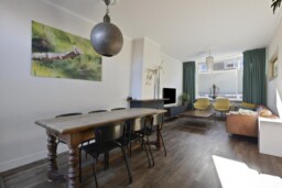 Binnen ontvouwt het huis zich op een aangename manier. Achter de voordeur wacht een woning die direct warmte uitstraalt. De living voelt uitnodigend en licht, met grote raampartijen aan voor- en achterzijde die gedurende de dag zorgen voor een mooie, natuurlijke lichtinval. De houten parketvloer en de open haard versterken het gevoel van geborgenheid en geven de ruimte een karakter dat je niet eenvoudig nieuw bouwt, maar dat je alleen vindt in huizen met een ziel. Het is de plek waar lange avonden vanzelfsprekend worden en waar je je meubels moeiteloos ziet landen.