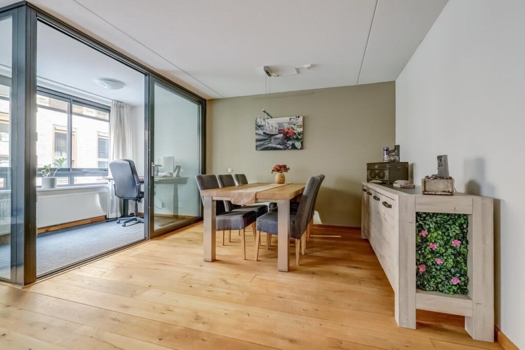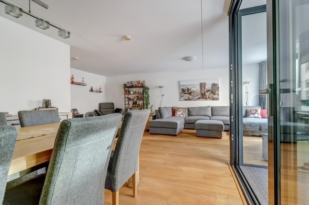 De woonkamer valt direct op door de prachtige massief houten vloer en biedt via een schuifdeur toegang tot de inpandige loggia _ een heerlijke, veelzijdige plek waar u naar hartenlust kunt ontspannen of werken.