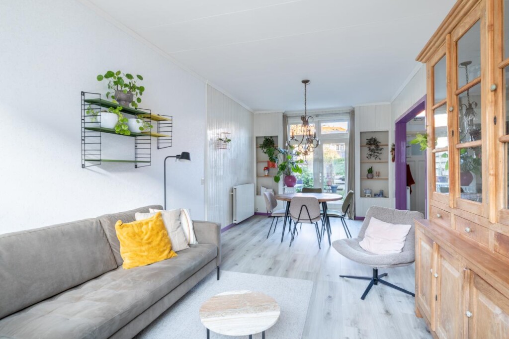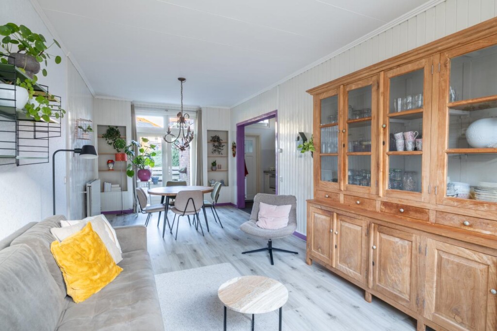 De woonkamer en eetkamer vormen samen één doorlopende leefruimte waar licht, rust en sfeer vanzelf samenkomen. Openslaande tuindeuren verbinden binnen moeiteloos met buiten, waardoor de tuin echt onderdeel wordt van het dagelijks wonen. De keuken ligt logisch aan de zijkant en sluit mooi aan op het leefgedeelte. Boven zijn meerdere slaapkamers en een badkamer aanwezig, terwijl de vaste trap naar de zolder zorgt voor extra ruimte en mogelijkheden. Dit is zo’n huis dat niet hoeft te overtuigen met grootse gebaren, maar met gevoel, verzorging en een kloppende indeling. Knus, karaktervol en verrassend compleet _ precies het soort woning waar je je snel thuis voelt.