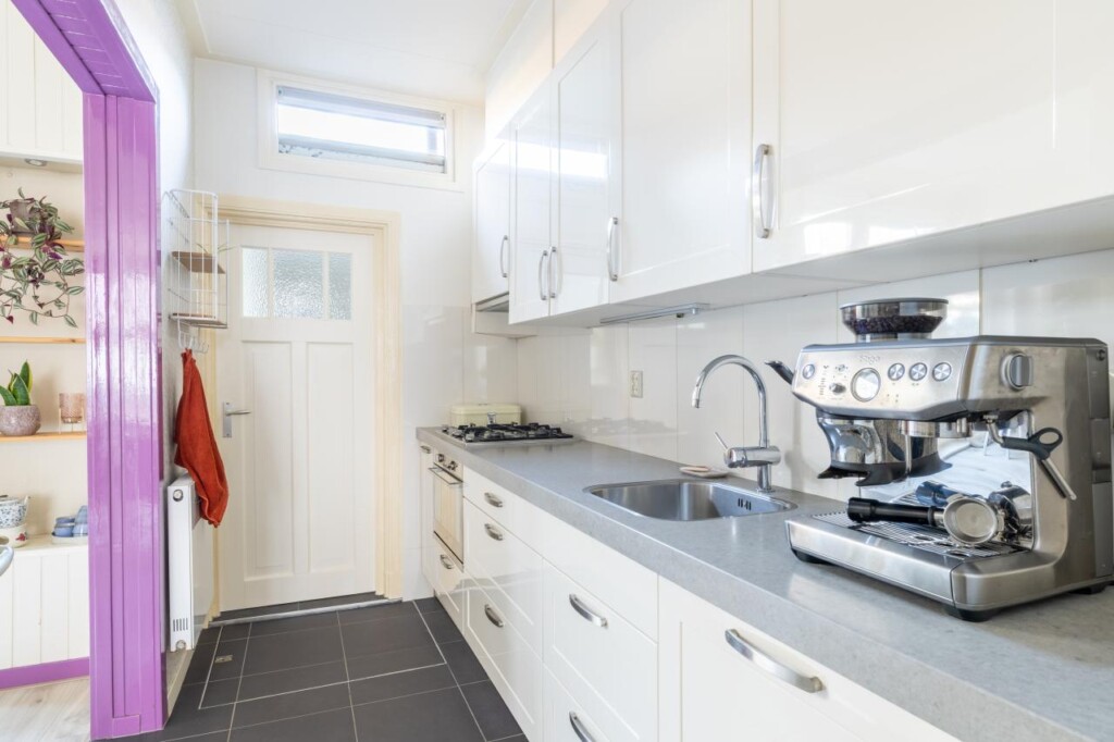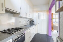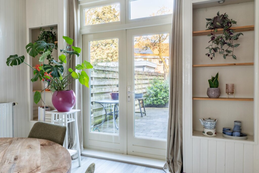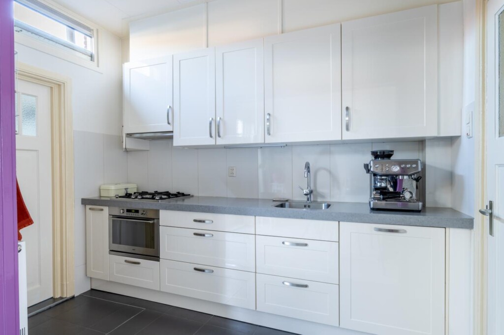 De woonkamer en eetkamer vormen samen één langgerekte ruimte, waarin je vanzelf doorloopt van zitgedeelte naar eettafel. Hoge plafonds en grote ramen zorgen voor een prettige lichtinval, terwijl originele details zoals glas-in-lood bijdragen aan de sfeer. Aan de achterzijde openen de tuindeuren zich naar de tuin, waardoor binnen en buiten moeiteloos in elkaar overlopen. De keuken ligt aan de zijkant van de woning en is praktisch ingericht met lichte fronten en diverse inbouwapparatuur, waaronder een Pelgrim gaskookplaat, combimagnetron, vaatwasser en vlakschermafzuigkap. Een koel-/vriescombinatie vind je in de aangrenzende bijkeuken, eveneens hetzelfde uitgevoerd als de keuken. Daarnaast zijn de witgoedaansluitingen hier praktisch gesitueerd in een wandkast. Een functionele, verzorgde ruimte die logisch aansluit op het dagelijkse gebruik.