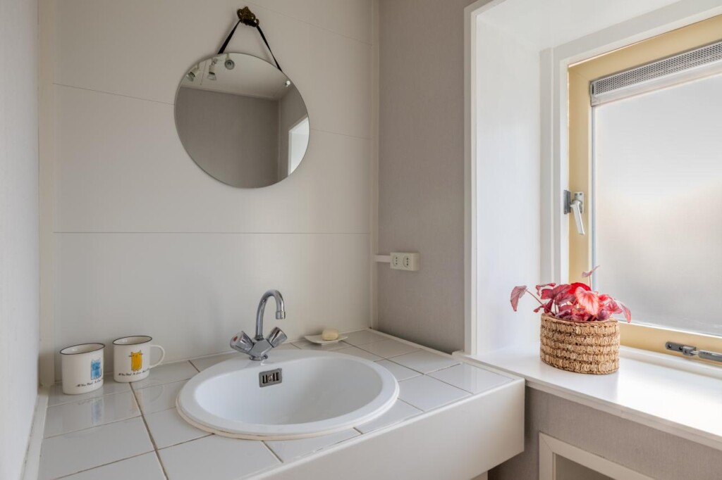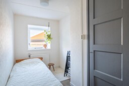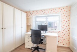 Via de trap bereik je de overloop op de eerste verdieping, die toegang geeft tot drie slaapkamers en de badkamer. De kamers zijn prettig van formaat en flexibel in te richten, of je nu een slaapkamer, werkruimte of logeerkamer nodig hebt. Dankzij de ramen voelt elke ruimte licht en open aan. Waar de hoofdslaapkamer is voorzien van een ingebouwde wandkast over de gehele diepte, zijn de twee overige kamers voorzien van een handige bergkast. De badkamer is praktisch en overzichtelijk ingericht met een douche en wastafel. Geen overdaad, maar een fijne, functionele ruimte die past bij het karakter van de woning en het dagelijks gebruik.