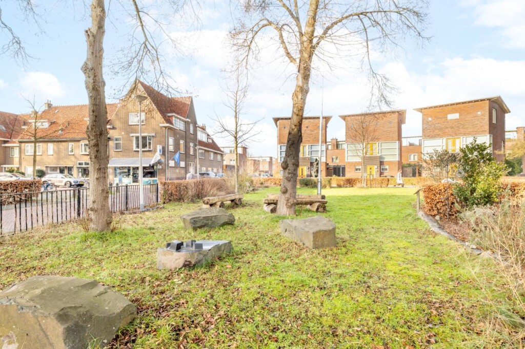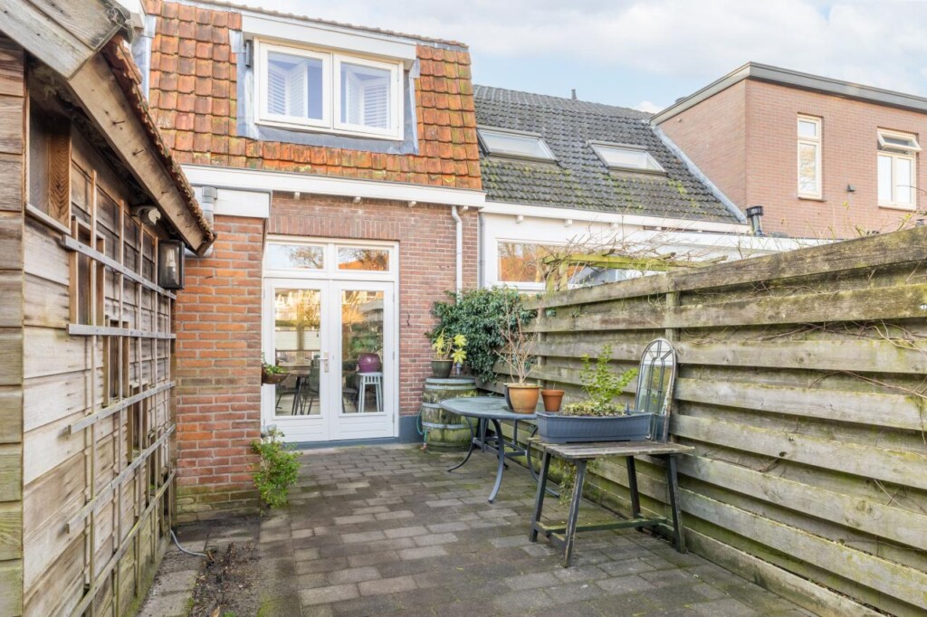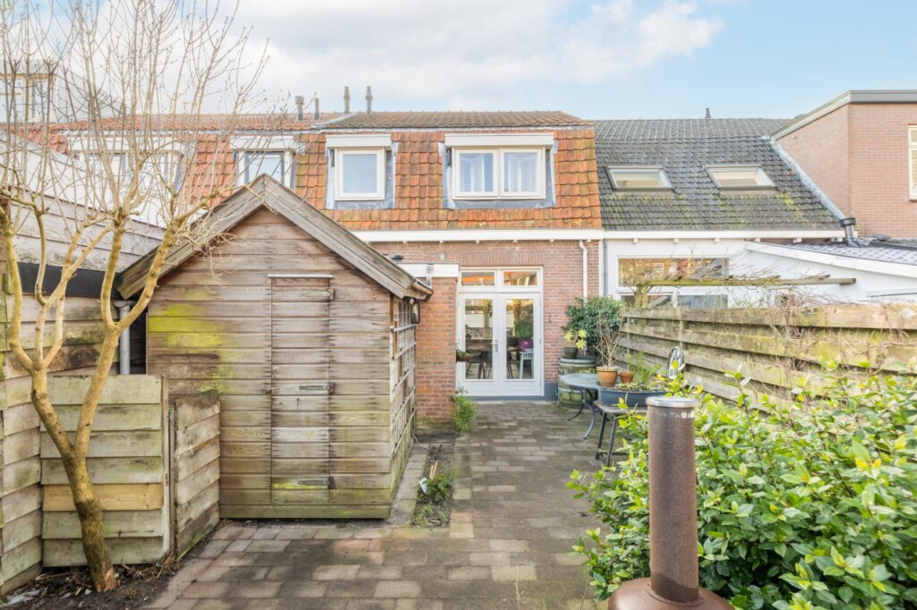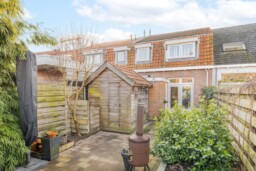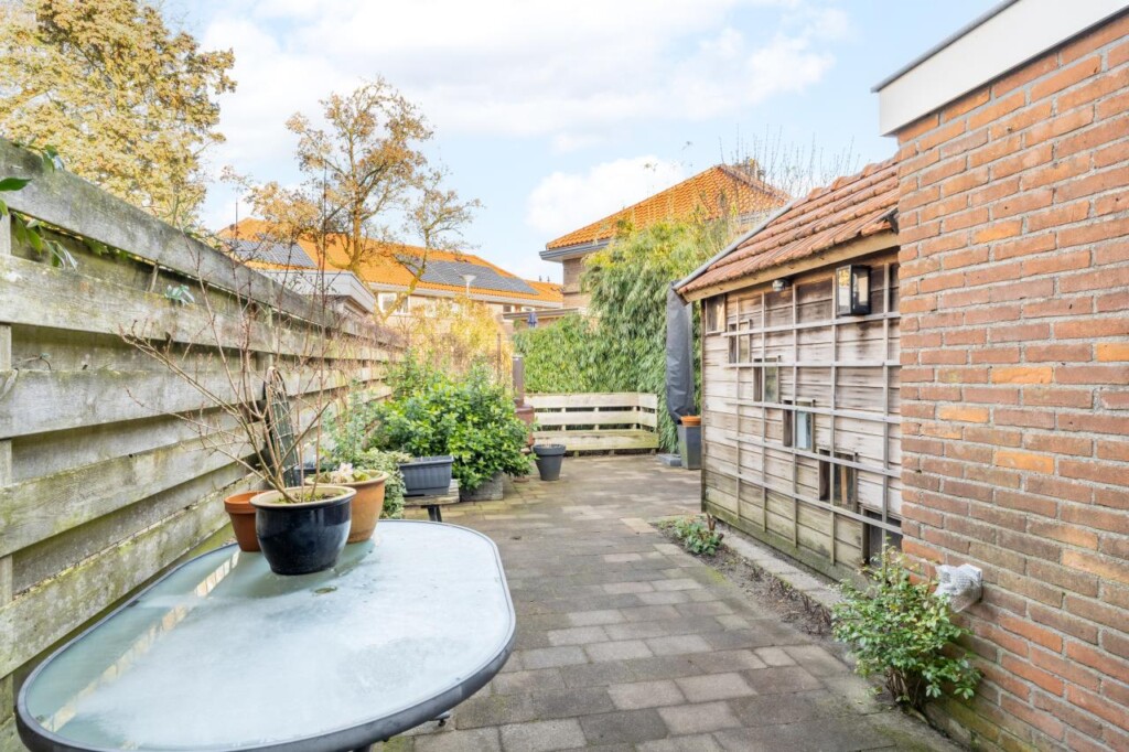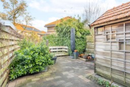 De achtertuin is knus, besloten en overzichtelijk aangelegd. Een fijne plek om buiten te zitten, met voldoende privacy en precies de juiste schaal voor wie wel wil genieten, maar geen uren wil onderhouden. Achterin staat een dubbelwandige houten berging met dakpannen, ideaal voor fietsen en tuingereedschap. Aan de voorzijde beschikt de woning over een geveltuin met wateropvang en een zinken afvoerpijp, een detail dat bijdraagt aan zowel duurzaamheid als uitstraling.