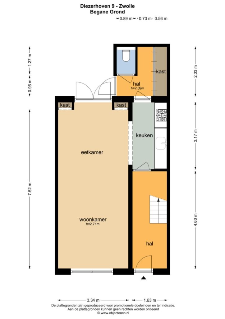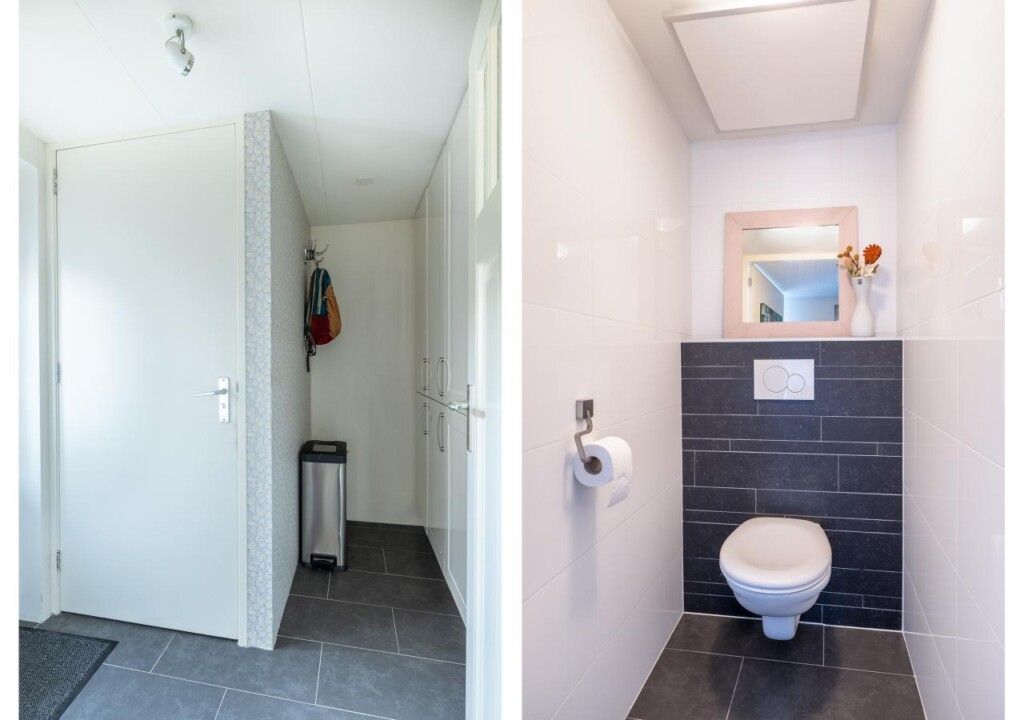 Je komt binnen in een diepe hal die direct de toon zet. Rechts de trapopgang naar boven, rechtdoor richting het leefgedeelte. Achter in de bijkeuken bevindt zich het separaat gesitueerde toilet, netjes uit het zicht maar logisch bereikbaar.