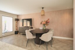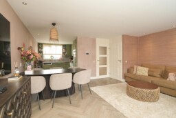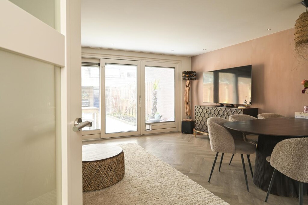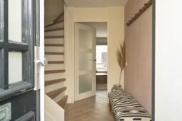Keurige voortuin met entree. Bij binnenkomst tref je de hal met meterkast, modern toilet en trapopgang. De lichte woonkamer is voorzien van een PVC vloer met vloerverwarming en heeft middels een schuifpui direct toegang tot de achtertuin.