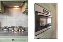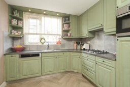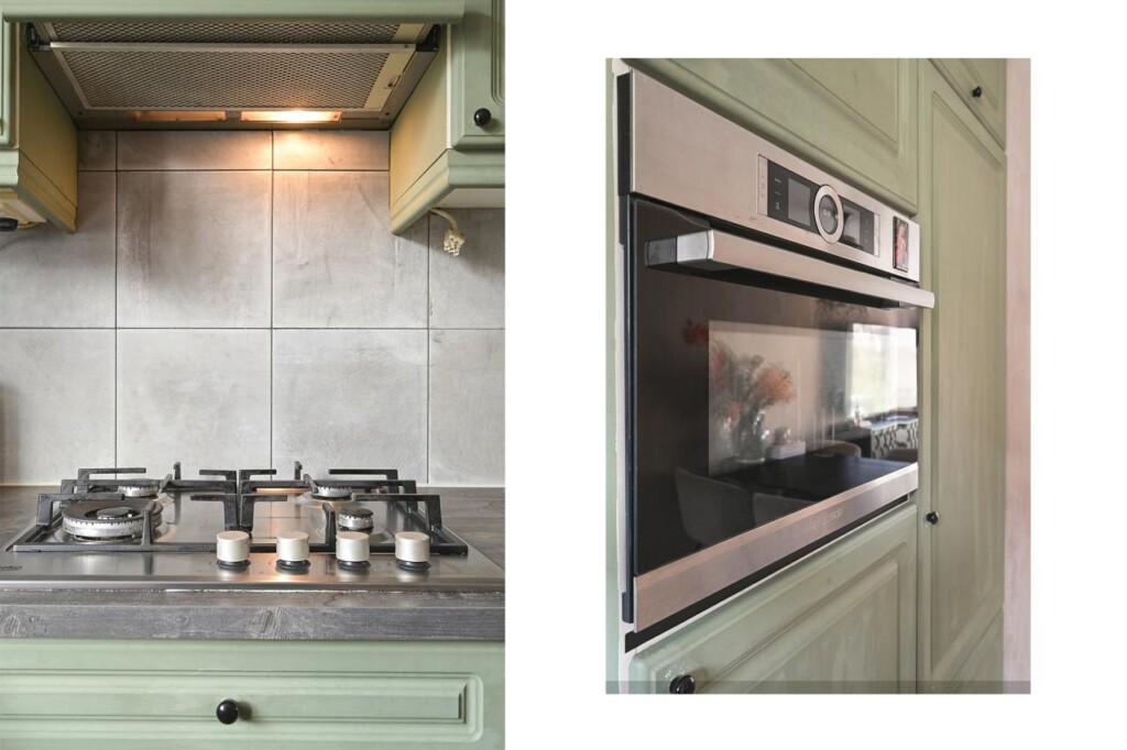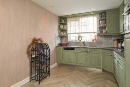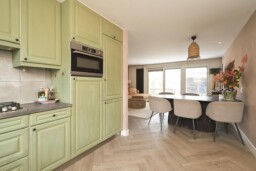 De open keuken aan de voorzijde is uitgevoerd in een praktische L-opstelling en beschikt over diverse inbouwapparatuur.
