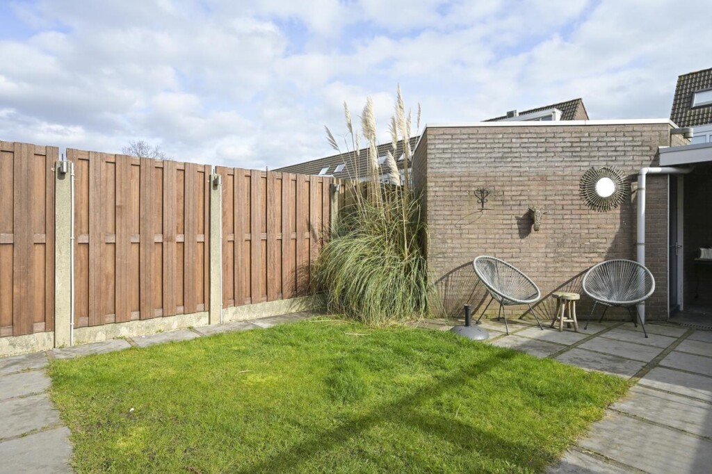 De zonnige achtertuin is gelegen op het zuidoosten en beschikt over een zonnescherm, vrijstaande stenen berging en een achterom met achterpad.