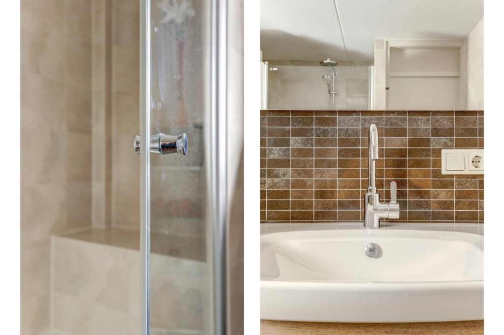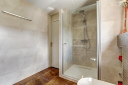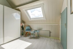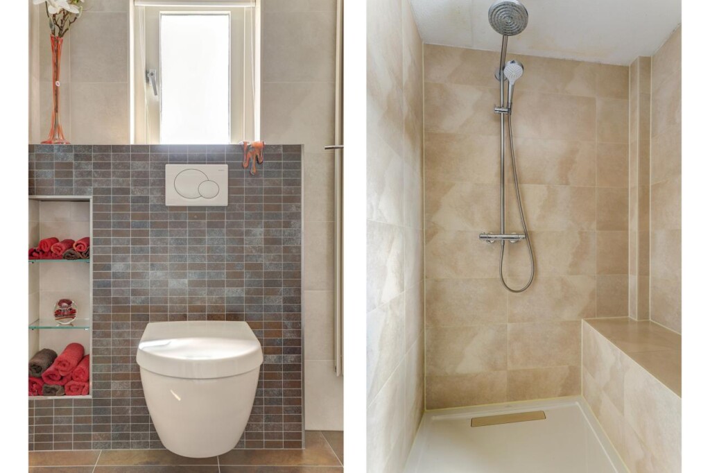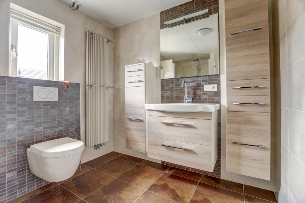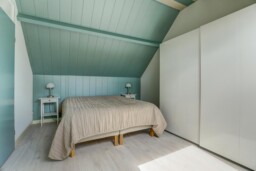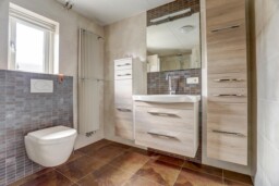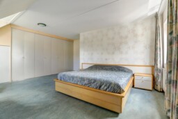 Op de eerste etage treft u twee ruime slaapkamers, waarvan de master bedroom oorspronkelijk bestond uit twee kamers en nu voorzien is van een grote kastenwand. De tweede slaapkamer beschikt eveneens over een vaste kastenwand. De nette badkamer is uitgerust met een regendouche, handdouche, toilet en een wastafelmeubel met veel bergruimte.