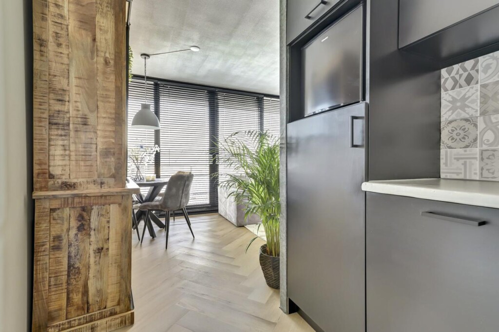De lichte woonkamer dankt zijn prettige sfeer aan de grote raampartij en de schuifpui naar het royale balkon. De open keuken is in een hoekopstelling geplaatst en in 2025 volledig gemoderniseerd en voorzien van diverse inbouwapparatuur, waaronder een koelkast, vaatwasser, 4-pits inductieplaat, wasbak en afzuigkap. Dankzij de slimme indeling is er voldoende opbergruimte.