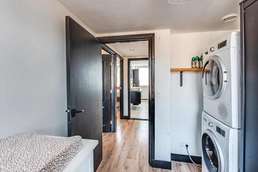 Eerste verdieping: ruime overloop, twee in grootte variërende slaapkamers en een derde compacte kamer die dient als wasruimte, moderne badkamer met ruime douche, ligbad, wastafel en deur naar balkon.