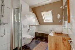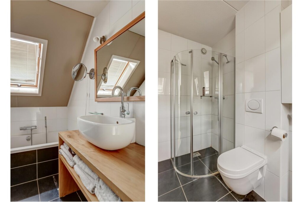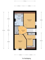 De overloop biedt toegang tot drie slaapkamers van ca. 10,5 m², 10,5 m² en 8 m². De badkamer beschikt over een ligbad, aparte douche, wastafel en tweede toilet. Daarnaast is er een handige inbouwkast voor extra bergruimte.