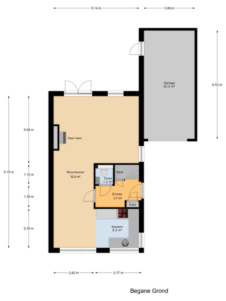 Via de centrale hal zijn het toilet, de trap naar de eerste verdieping en de lichte L-vormige woonkamer bereikbaar. Grote raampartijen aan de voor- en zijkant zorgen voor veel daglicht. De open keuken aan de voorzijde is voorzien van inbouwapparatuur. Vanuit de achtertuin is er een praktische doorgang naar de garage.